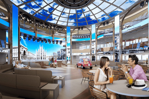 Главный атриум лайнера Costa Smeralda называется Colosseo и полностью оправдывает свое имя. Этот круглый холл занимает целых 3 палубы (№6, №7 и №8). Стены и купол пространства оснащены большими экранами, которые позволяют создать нужную атмосферу в зависимости от места прибытия лайнера в круизе.