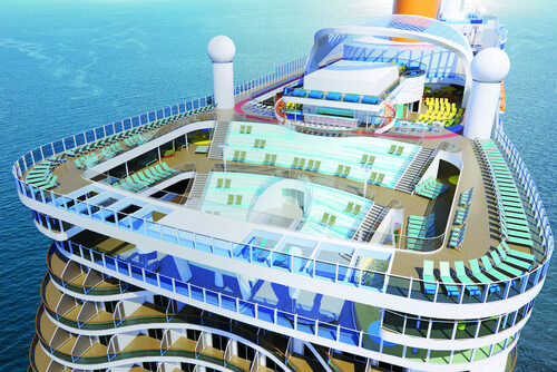 При конструировании лайнера Costa Smeralda было предусмотрено сразу несколько зон для водного отдыха в круизе и принятия солнечных ванн.
