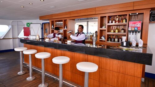 Бар у головному лаунжі лайнера з великим вибором алкогольних та безалкогольних напоїв.